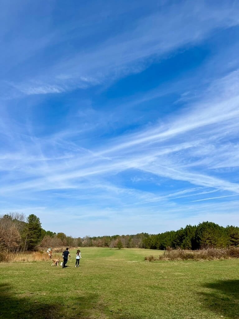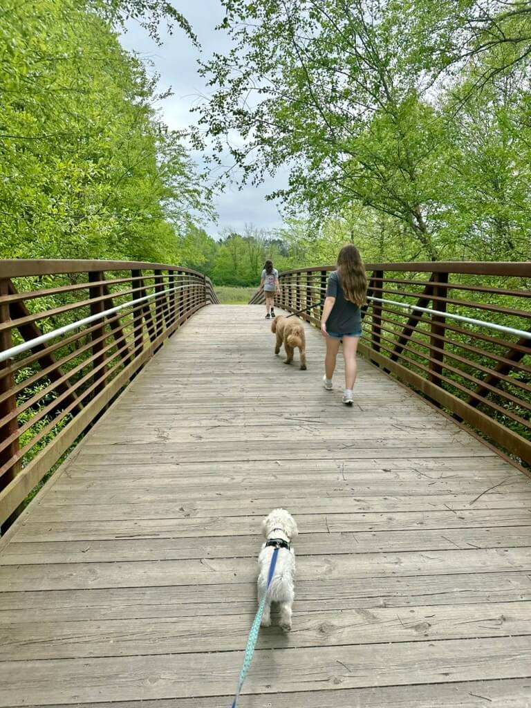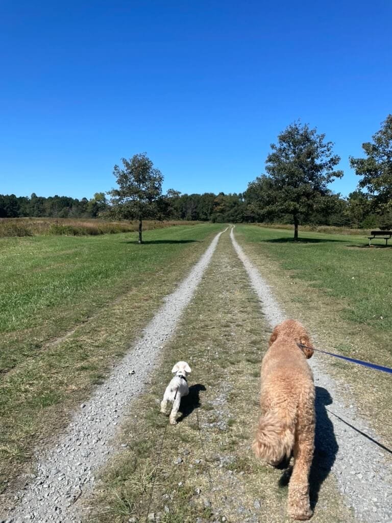 The trails here are mostly flat which is nice for senior dogs and a more leisurely stroll. The first part is a large field and as you go further back, there’s lots of shade in the wooded area. Our family loves these trails. Something for everyone!